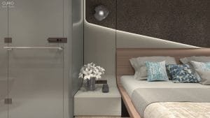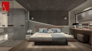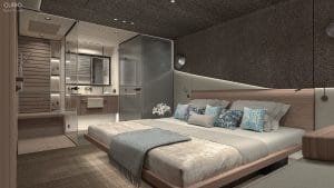 Master kabinin merkezinde yer alan geniş yatak, modern hatları ve yatak başından tavana uzanan stingray görünümlü panel ile dikkat çekiyor. Beyaz deri üzerine, doku zenginliği oluşturan akıcı materyaller ve modern aydınlatma ürünleri, kabin içinde huzurlu bir atmosfer yaratıyor. Entegre banyo tasarımı, şık cam bölme ile ayrılmış olup, oda ile organik bir bütünlük içinde modern lüksün ve fonksiyonelliğin mükemmel bir örneğini sunuyor. Ayrıca, yatak yanında konumlanmış makyaj masası, fonksiyonel detaylarla konforu sürdürülebilir kılıyor.