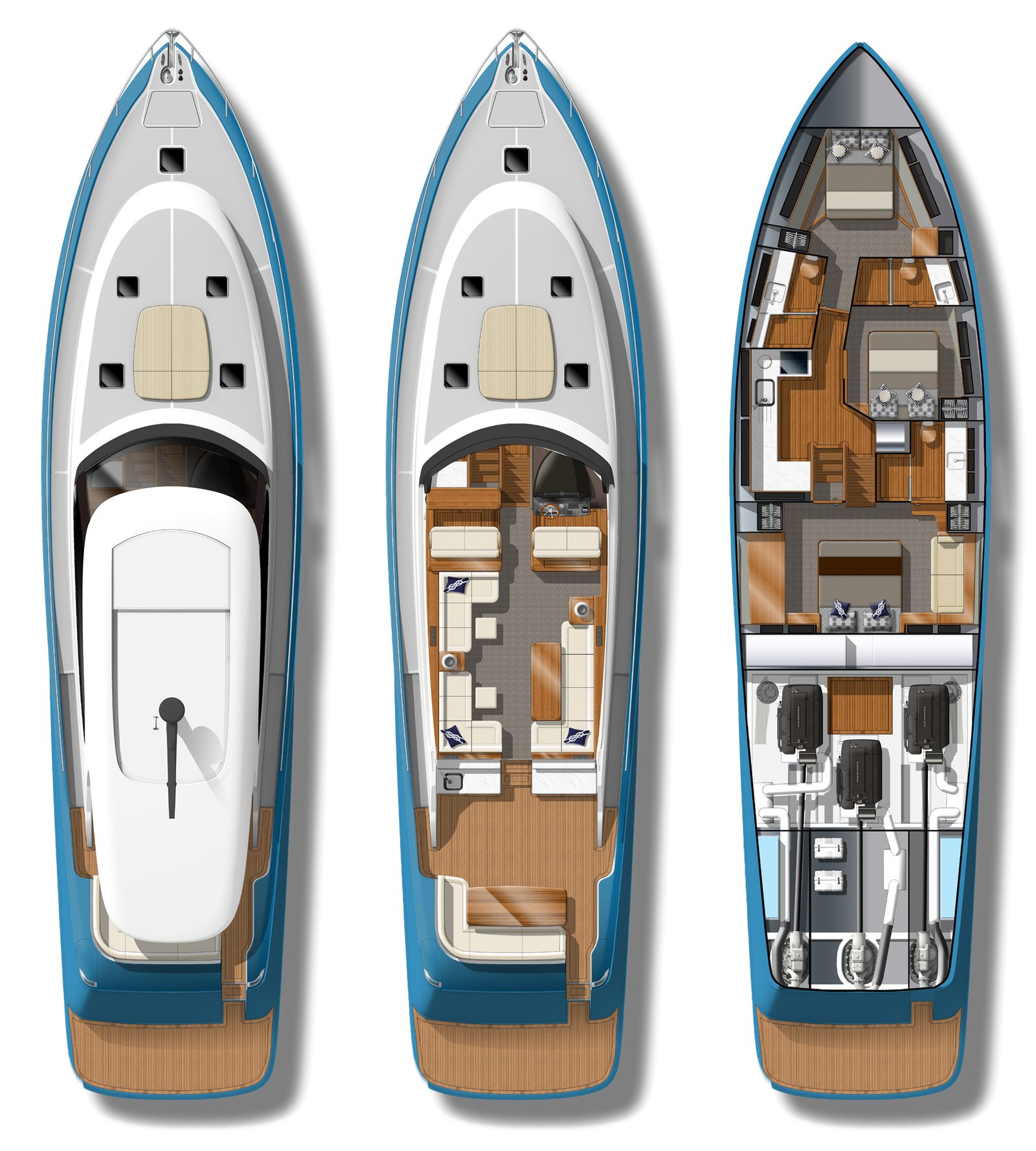 24 metre (79 feet) uzunluğa ve 5,83 metre genişliğe sahip olan GT70 RS, spor çizgileri ve agresif duruşuyla dikkat çekiyor. Gövde tasarımı, yüksek hızlarda bile maksimum stabilite sağlarken, geniş güvertesi ve ferah iç mekânları lüksü her detayda hissettiriyor.